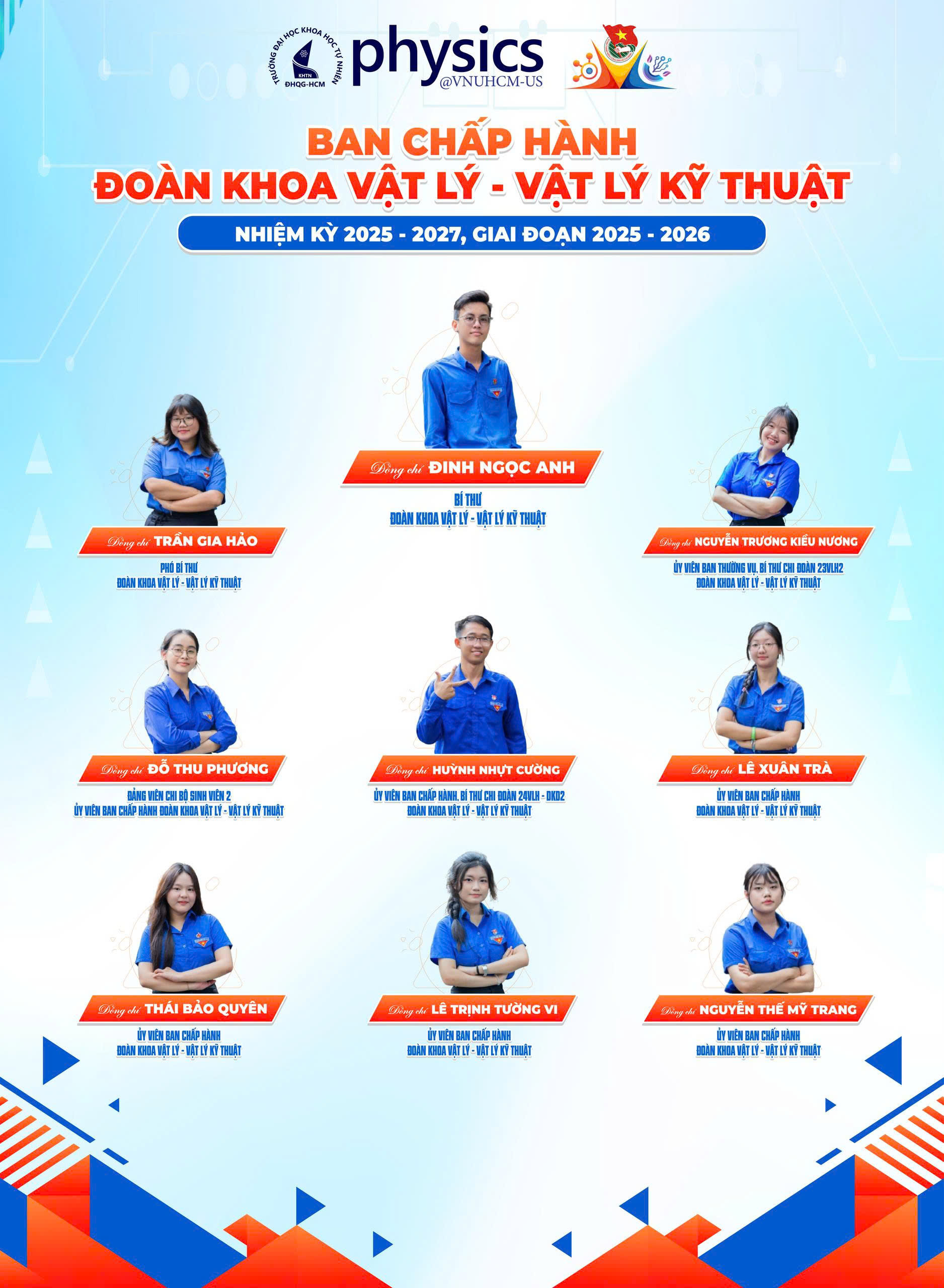 Trải qua một nhiệm kỳ với nhiều biến động và thách thức, Đoàn khoa Vật lý - Vật lý Kỹ thuật đã khẳng định được bản lĩnh của một đơn vị giàu truyền thống. Tiếp nối ngọn lửa nhiệt huyết ấy, Đại hội nhiệm kỳ 2025 - 2027 đã tín nhiệm bầu ra Ban Chấp hành mới gồm 9 đồng chí.