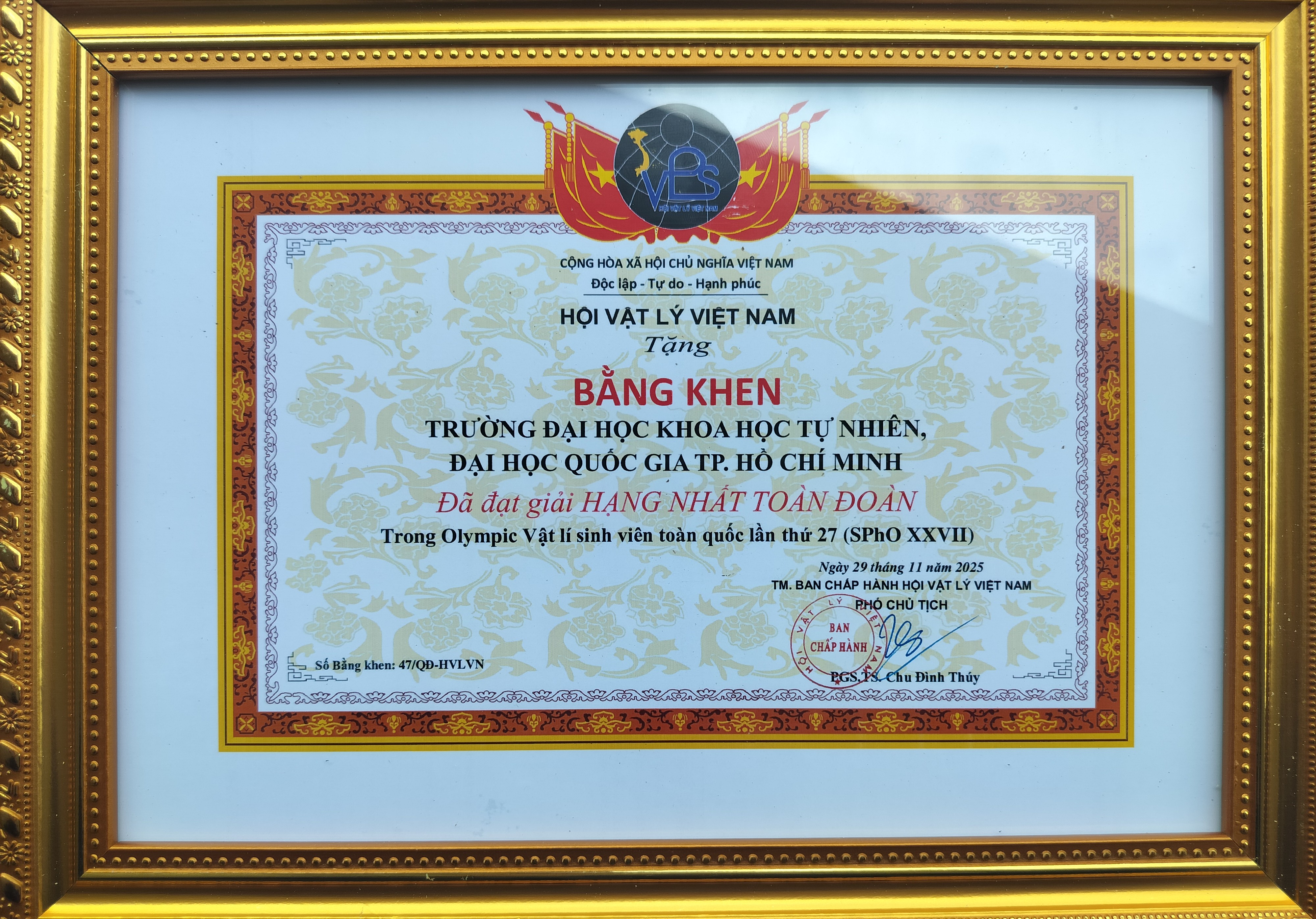 Đội tuyển sinh viên Trường Đại học Khoa học tự nhiên, ĐHQG-HCM đã xuất sắc đạt Hạng Nhất toàn đoàn tại Kỳ thi Olympic Vật lý Sinh viên Toàn quốc lần thứ XXVII (SPhO 27), diễn ra từ ngày 27 – 30/11 tại Trường Đại học Công nghệ Miền Đông (Đồng Nai). Thành tích này tiếp tục khẳng định vị thế của Nhà trường và Khoa Vật lý - Vật lý kỹ thuật trong đào tạo – nghiên cứu khoa học cơ bản và bồi dưỡng tài năng trẻ trong lĩnh vực Vật lý.