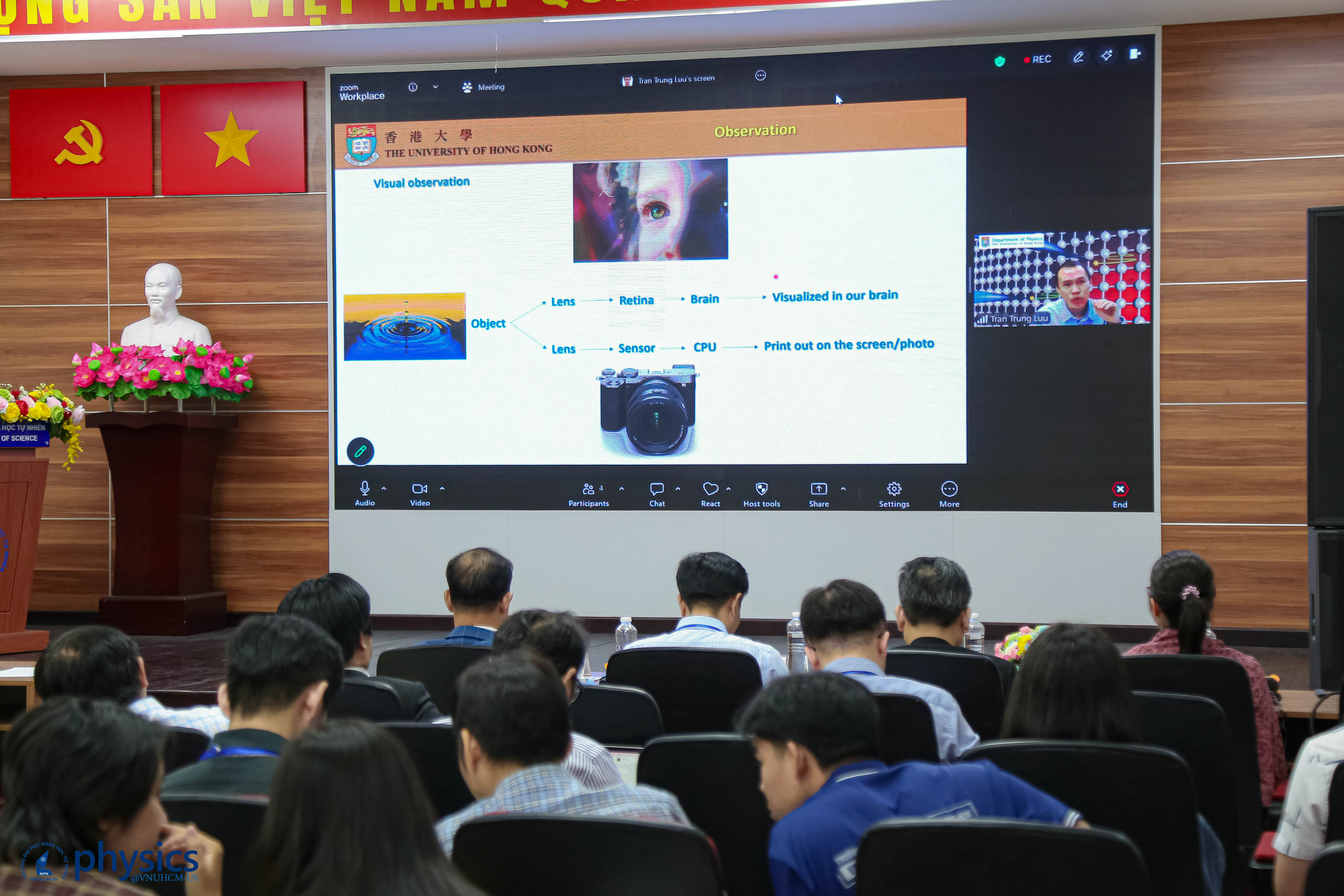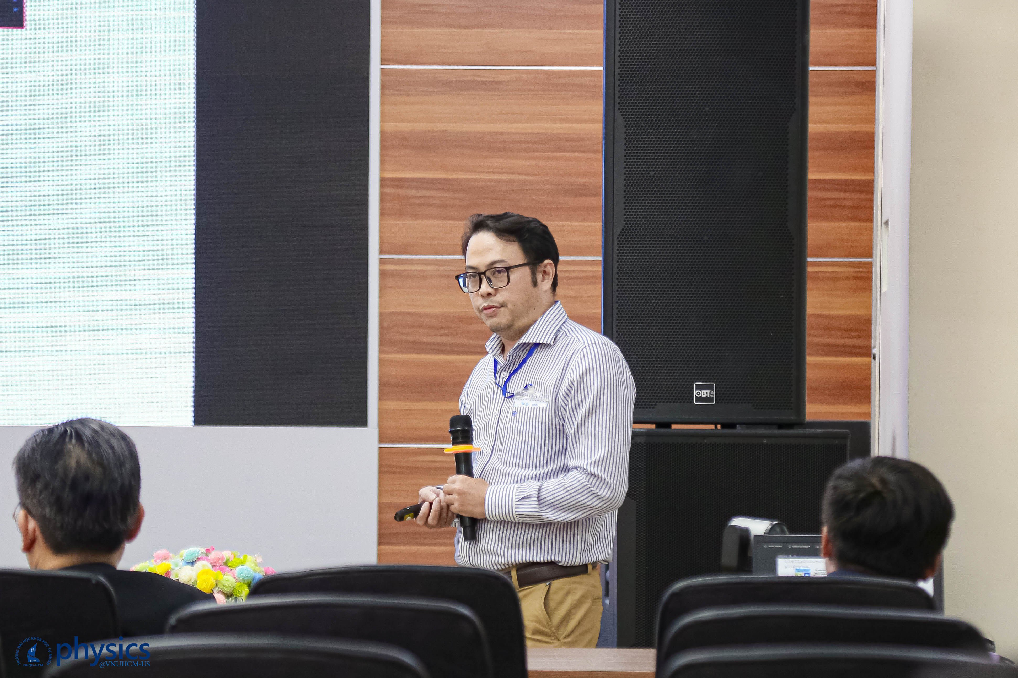 Phiên thứ hai tập trung vào các hiện tượng quang học phi tuyến và tương tác ánh sáng - vật chất ở thang năng lượng cao. PGS. Lưu Trần Trung (ĐH Hong Kong) trình bày nghiên cứu về phổ hài bậc cao như một công cụ thăm dò động lực học mạng tinh thể, cho thấy tiềm năng của kỹ thuật này trong việc khảo sát cấu trúc vật liệu lượng tử ở thang thời gian cực ngắn. PGS. Phan Ngọc Loan (Trường ĐH Sư phạm TP. HCM) tiếp nối với báo cáo về cơ chế phổ sóng hài bậc cao có hỗ trợ terahertz, trong đó đề xuất khả năng mở rộng ngưỡng cắt phổ một cách phổ quát và kiểm soát đối xứng orbital, những kết quả có ý nghĩa quan trọng đối với việc phát triển nguồn bức xạ coherent tần số cao trong tương lai.