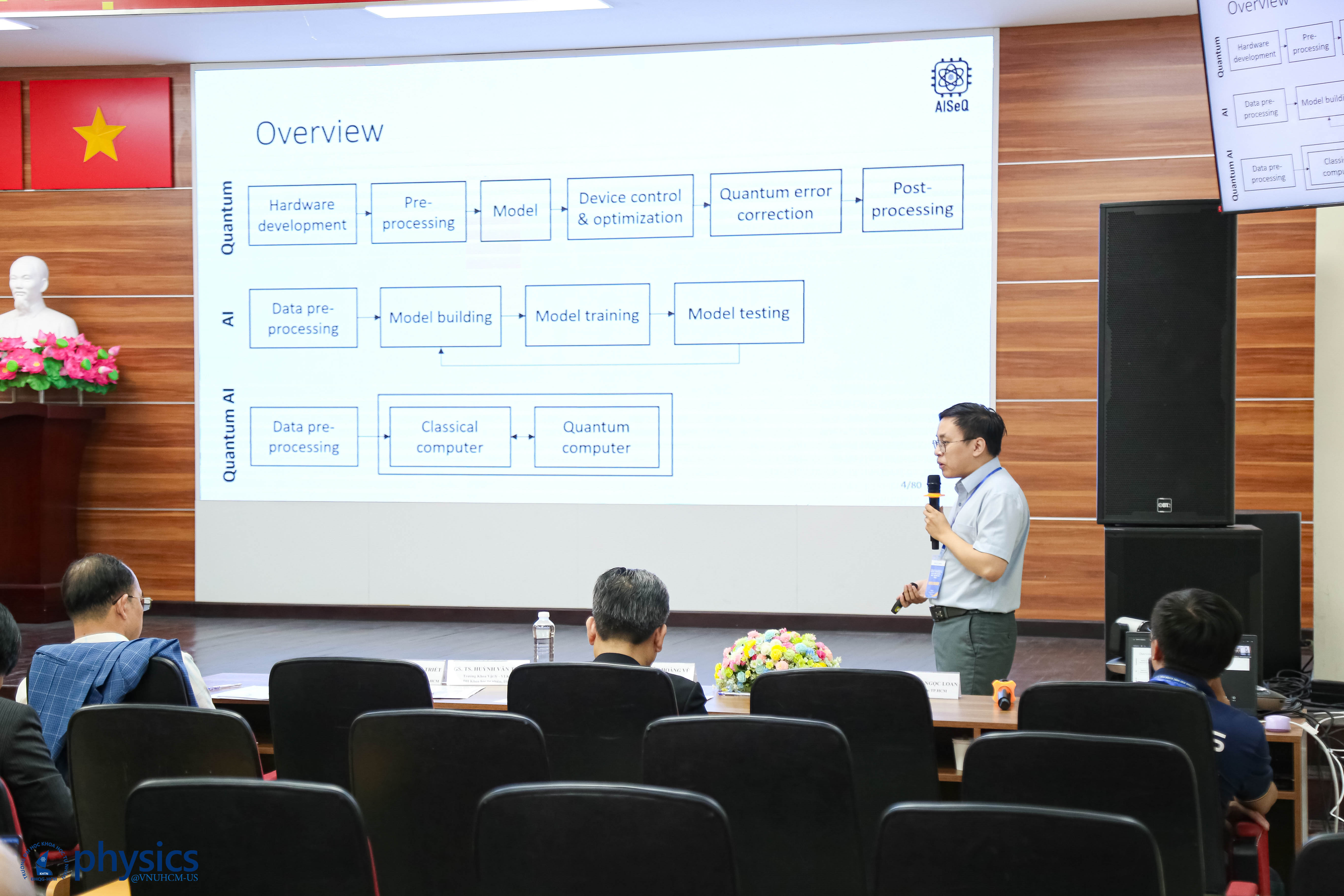 Phiên cuối hướng đến mối giao thoa giữa điện toán lượng tử và trí tuệ nhân tạo, hai lĩnh vực đang tạo ra những đột phá công nghệ sâu rộng. TS. Vũ Tuấn Hải (Trường ĐH Công nghệ Thông tin, ĐHQG-HCM) khám phá sự tương hỗ giữa học máy và lượng tử học và chỉ rõ ra rằng hai lĩnh vực này không chỉ bổ trợ mà còn có thể thúc đẩy lẫn nhau phát triển. TS. Trần Nguyên Lân trình bày các phương pháp giải bài toán nhiều hạt bằng máy tính lượng tử, một trong những thách thức lớn nhất của vật lý lý thuyết hiện đại mà điện toán lượng tử đang dần chứng minh được lợi thế vượt trội so với điện toán cổ điển.