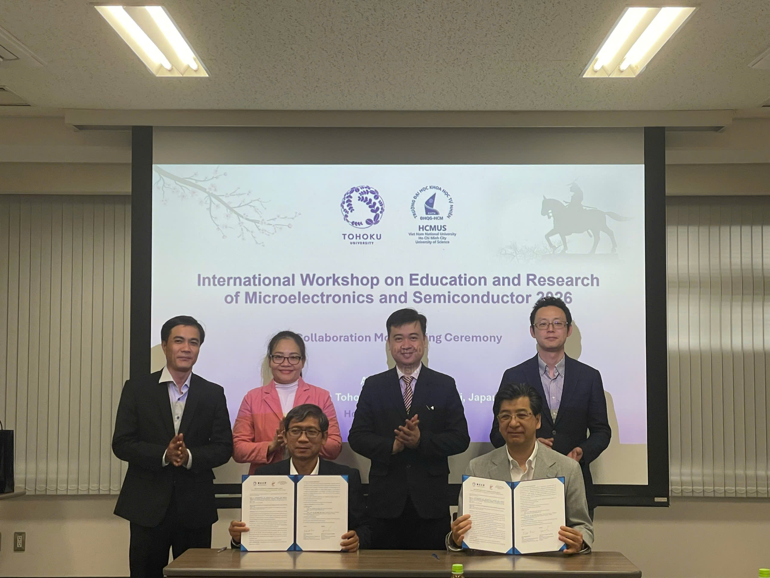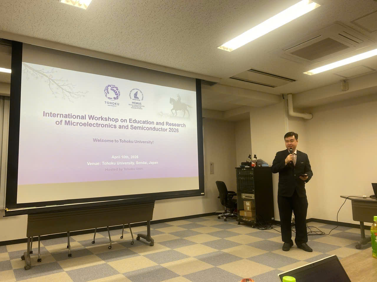 Ngày 08 đến 11 tháng 04 năm 2026, đoàn công tác của Trường Đại học Khoa học Tự nhiên, ĐHQG-HCM do PGS.TS. Trần Minh Triết - Phó Hiệu trưởng làm Trưởng đoàn và 3 cán bộ- giảng viên của Khoa Vật lý-VLKT (PGS.TS. Huỳnh Văn Tuấn- Trưởng khoa, PGS.TS. Nguyễn Văn Hiếu-Chủ tịch Hội Công nghệ vi mạch bán dẫn Tp.HCM và PGS.TS. Vũ Thị Hạnh Thu) đã có đến làm việc, tham dự Hội thảo Quốc tế và thảo luận cho các chương trình hợp tác tại Đại học Tohoku (TU), Thành phố Sendai, Nhật Bản. TU chính thức sát nhập, thành lập từ năm 1907 và là National University thuộc top 3 của Nhật với các trường/viện (10 faculties, 15 graduate schools, 3 professional graduate schools, 6 research institutes, và 1 bệnh viện), số lượng sinh viên khoảng 18000 (trong đó có 3400 sinh viên quốc tế), 5 nhà khoa học nhận giải Nobel, xếp hạng theo lĩnh vực QS WUR,THE năm 2024 (Materials Sciences: 50; Physics &Astronomy: 50; Engineering and Technology: 89,…). TU được xem như là số 1 Nhật Bản về sản phẩm công nghệ MEMS, cảm biến, linh kiện điện tử từ dự án nghiên cứu PTN đến sản phẩm ra thị trường của doanh nghiệp. Năm 2026 này, số lượng người Việt Nam đang làm việc, nghiên cứu khoảng 12 (phó GS, trợ lý GS, post-doc,…) và khoảng 30 sinh viên học thạc sĩ/tiến sĩ. Trong đó, các giảng viên, nghiên cứu viên và trợ giảng đến từ Trường ĐHKHTN là 05 người.