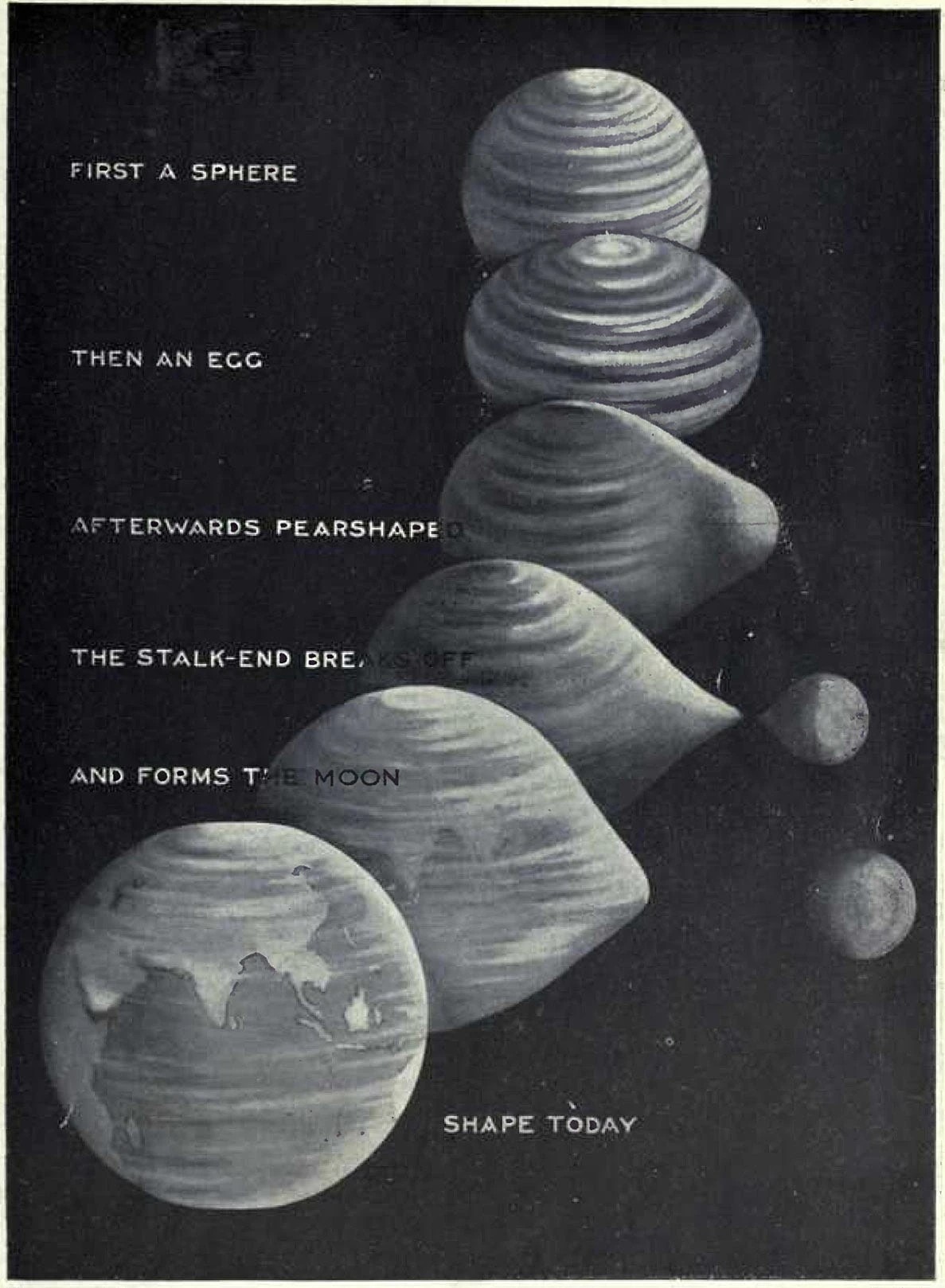 - Thuyết phân tách (The Fission Theory): Trong giai đoạn đầu của quá trình hình thành, Trái Đất được cho là quay với tốc độ cực cao, tạo ra lực ly tâm rất mạnh khiến cho một phần vật chất bị tách ra và hình thành nên Mặt Trăng. Tuy nhiên, để Mặt Trăng được hình thành dựa theo cơ chế của giả thuyết này, Trái Đất phải quay với một tốc độ cực kỳ nhanh, nhanh hơn rất nhiều so với bất kỳ tốc độ quay nào mà mô hình vật lý hiện đại cho phép, điều này được cho là không phù hợp với các tính toán về động lực học của Trái Đất.