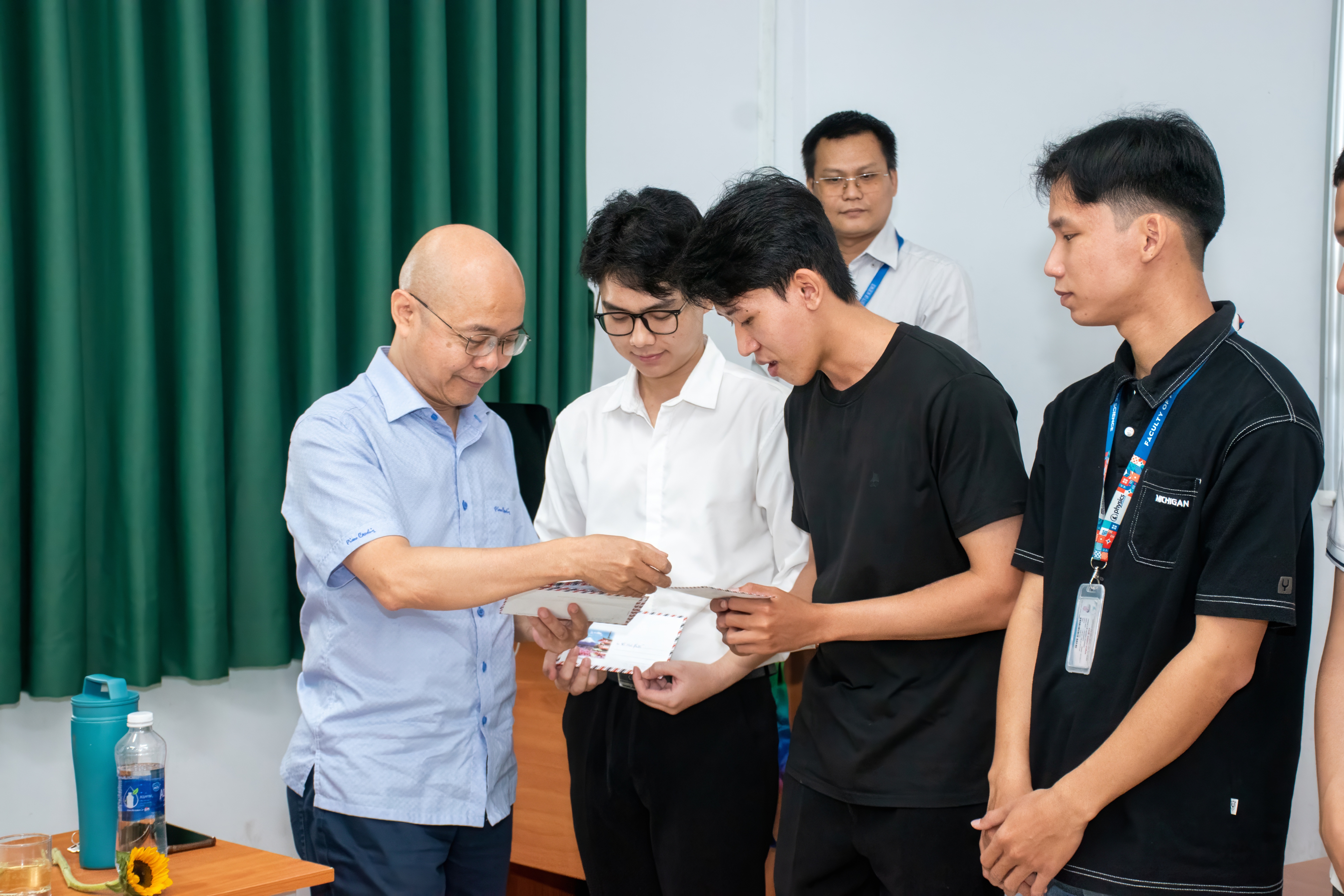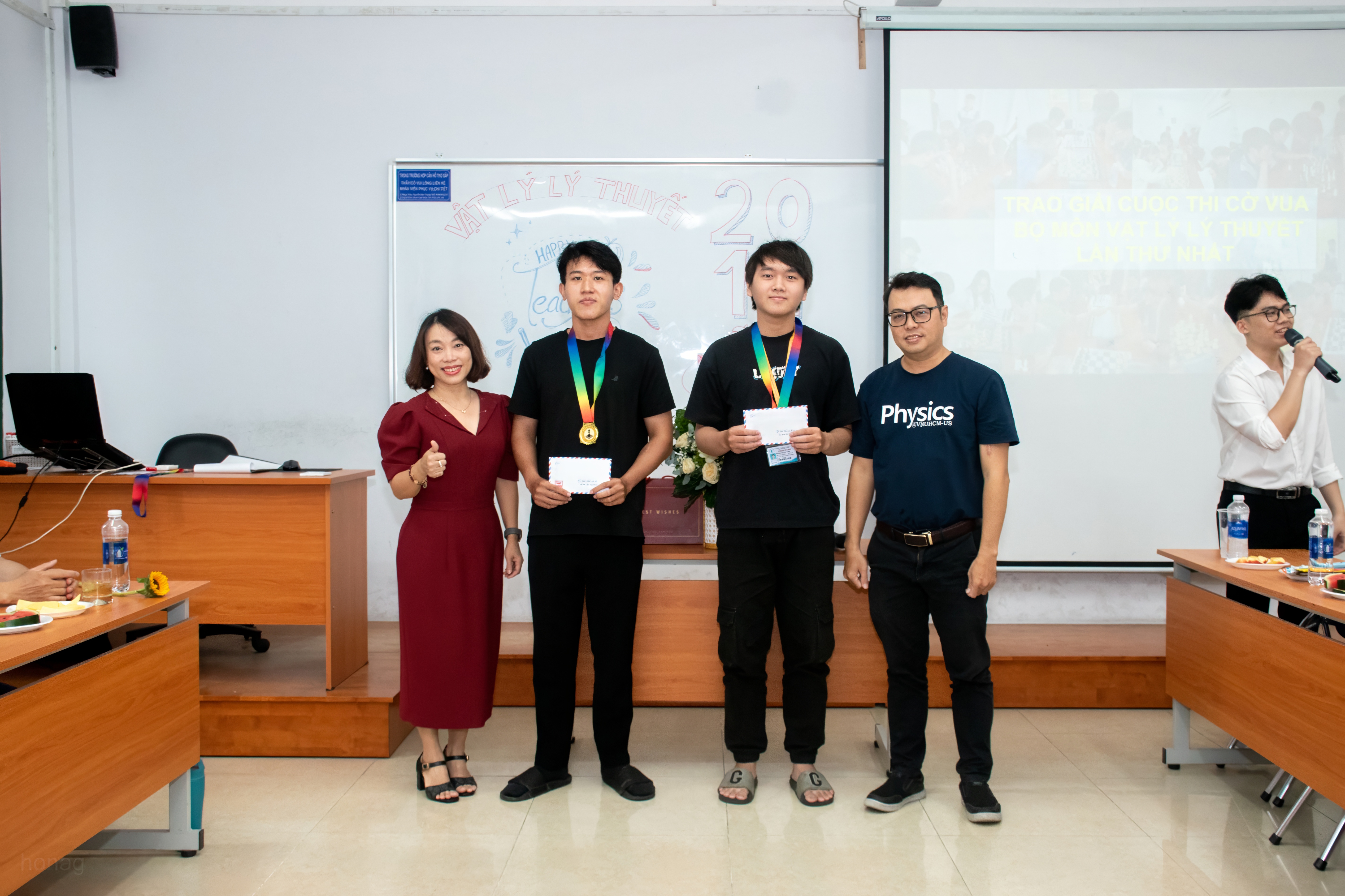 Nhân dịp lễ Nhà giáo Việt nam, ngày 17/11/2025, tại Bộ môn Vật lý Lý thuyết. Quỹ học bổng đã xét duyệt theo tiêu chí hoàn cảnh khó khăn cùng học lực khá trở lên, đã trao 7 suất (mỗi suất 5 triệu đồng) cho 7 em sinh viên: